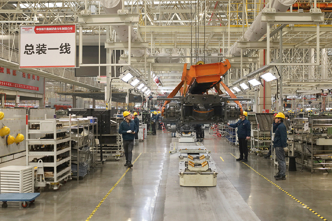 在智能化提效上,莱芜工厂生产线上221台机器人实现了装配、焊接、涂胶等工艺的自动化,焊点自动化率达到100%;173台AGV小车按设定轨道进行着零件配送、工作站之间物料传输等工作;总装车间双线布局,柔性生产可以支持柴油、天然气、氢能等多能源车型共线生产,双线平均每5分钟下线两辆重型卡车。